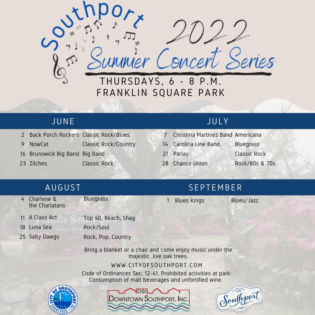 Concerts will be held at the Franklin Square Park located at 130 East West Street, Southport, NC. So grab some beach chairs and your dancing shoes and come on out!