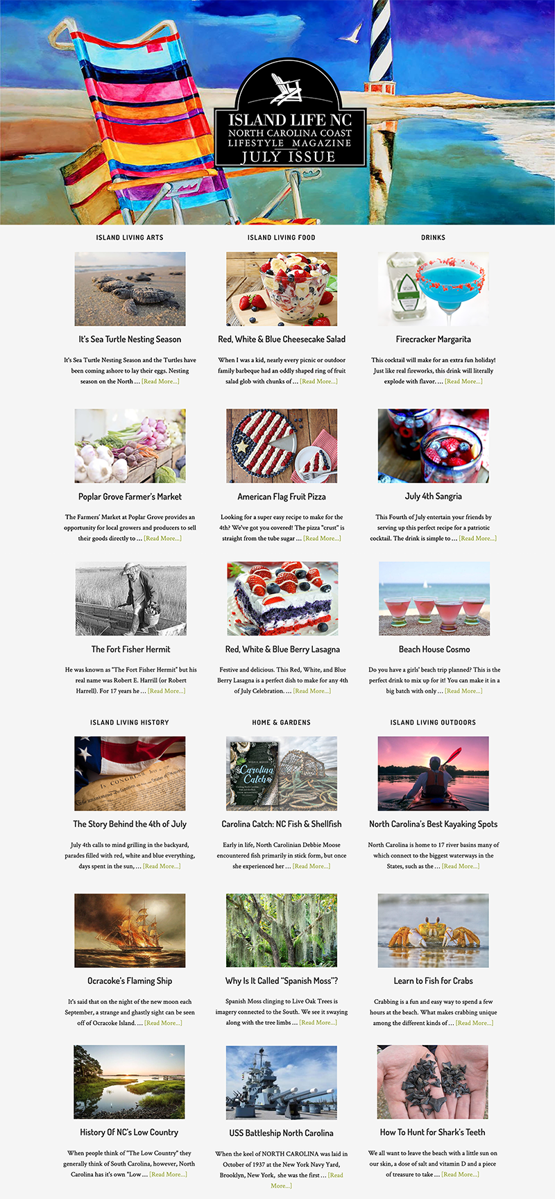 In the July Issue, read about The History of July 4th Celebrations, Festive Holiday Recipes, Refreshing Drink Recipes, Seafood Recipes, and happenings all along the North Carolina Coast!