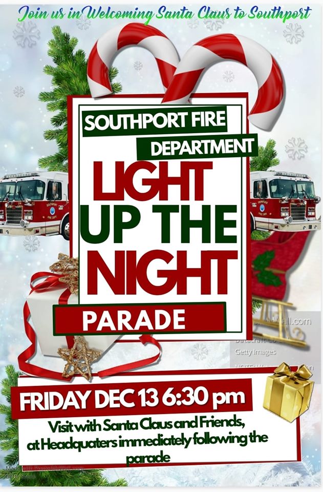 Children may board the fire engines at the Southport Fire Station before the parade at 5:30 p.m. and meet with Santa Clause at the Southport Fire Station after the parade.