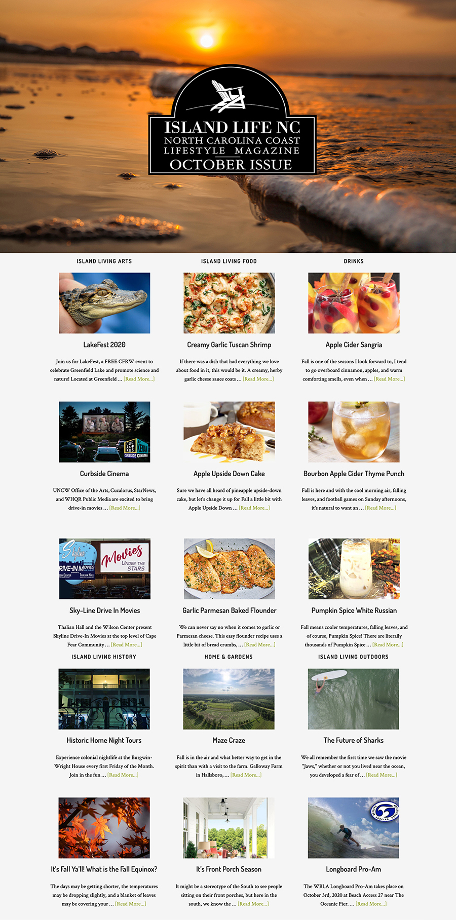 In the October Issue, read about the Future of Our Oceans, Drive-In Movies, Fall and Halloween Events, Surf Contests, Delicious Autumn recipes, refreshing drinks, and events all along the North Carolina Coast!