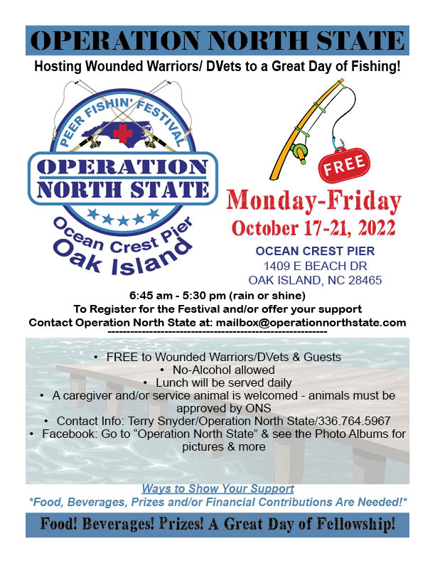 The Annual Oak Island Peer Fishing Festival will be held on Friday, October 17th – 21st, 2022 from 6:45 am to 5:30 pm (rain or shine). This event honors NC’s Wounded Warriors and Disabled Veterans.